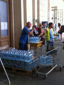 I was at Budapest-Keleti this morning for one of my weekend trips out of town, and I had a couple minutes to kill before boarding so I pulled out my current book, Catch-22 (I know, I haven’t read it yet). Reading about Yossarian and his zany flight squadron while waiting for a train, I had the occasion to look up from the book and idly glance around the station, and lo and behold, someone was setting up a FREE WATER BOTTLES table. I snapped a picture, which you can see here.