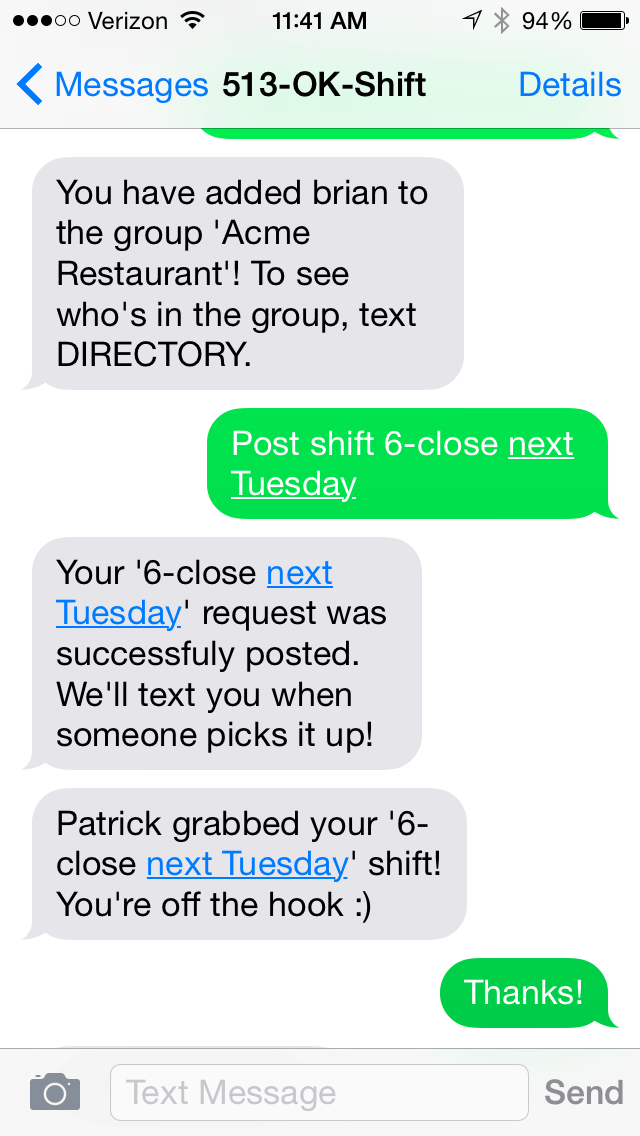 It all works by texting the number 513-OK-SHIFT (513-657-4438) and the system prompts you through the rest: posting shifts, adding coworkers, adding managers to approve, and broadcasting.